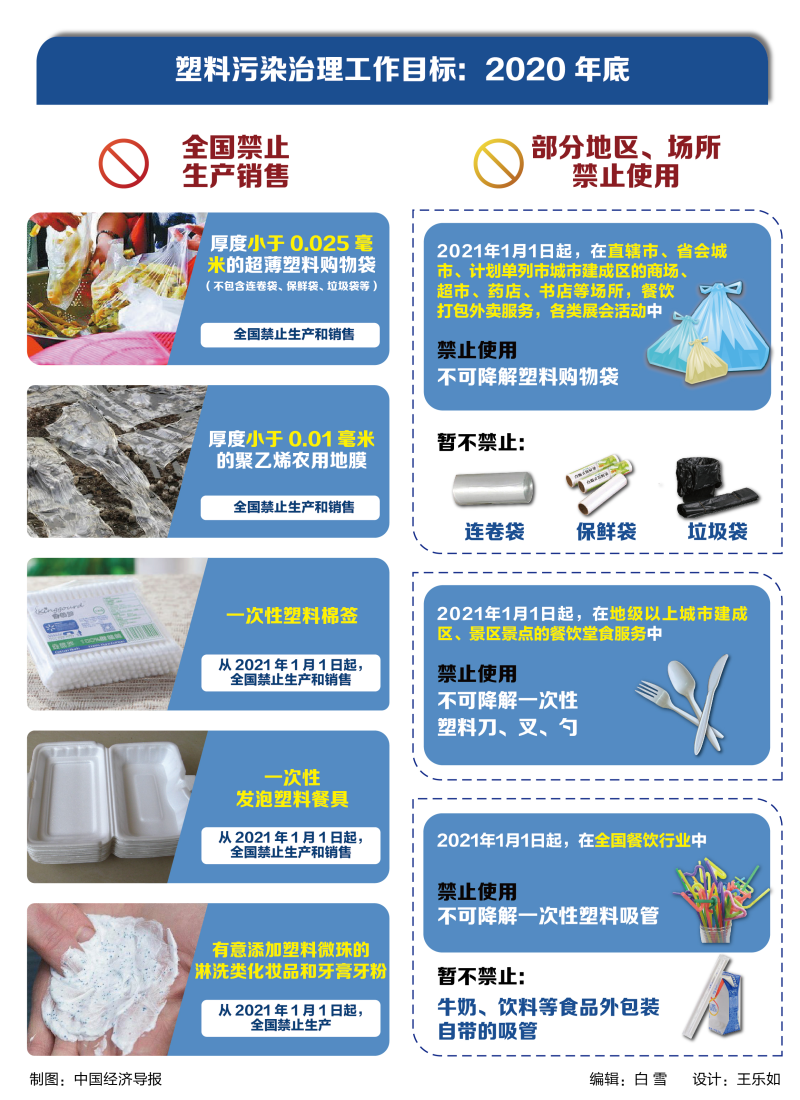 《通知》要求,对减塑重点领域,落实落细工作措施。重点围绕《意见》提出的2020年底要完成的目标任务,对禁限超薄塑料购物袋、超薄农用地膜、一次性发泡塑料餐具、一次性塑料棉签等,规范集贸市场塑料购物袋使用、加大塑料废弃物分类回收和处置等重点工作,逐项提出狠抓落实的措施,并明确了责任单位。要求各地生态环境、工业和信息化、住房城乡建设、农业农村、商务、文化和旅游、市场监管等部门要做好日常监管,着力解决堵点难点问题。各行业主管部门要及时将有关线索移交生态环境保护综合执法队伍。各地要于8月底前启动商场超市、集贸市场、餐饮行业等重点领域执法检查。中央有关部门将于年底前组织联合专项行动进行督导检查。