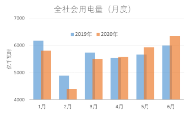 用电量是经济社会发展的晴雨表。上半年,我国用电量整体态势较好,增长显著超出预期。月度用电量增速由负转正,持续回升,5月和6月分别同比增长4.6%和6.1%,分别超出2019年同期2.3个百分点和0.6个百分点。二季度用电量同比增长3.9%,增速比一季度回升10.4个百分点。与世界其他主要国家用电量仍在下降相比,我国一枝独秀,显示出经济的韧性和发展的活力,表现出三大亮点。  图1 全社会用电量月度对比