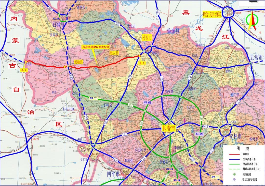 全长约206公里的松原至通榆高速公路项目,采用双向四车道高速公路标准,设计速度为120公里/小时,起点位于松原市与大广高速交叉处拐脖店互通,经前郭县、乾安县、通榆县,止于通榆县与内蒙古自治区科右中旗交界处。  松通高速起点:拐脖店收费站,位于松原市。