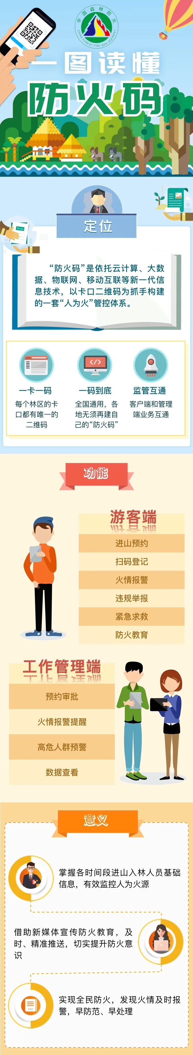 9月18日,国家林业和草原局召开电视电话会议,会上宣布“防火码”微信小程序正式上线,标志着“防火码”的全面推广使用。 “防火码”是依托云计算、大数据、物联网、移动互联等新一代信息技术,以卡口二维码为抓手构建的一套“人为火”管控体系。可以帮助进山人员快速扫码登记,主动学习防火知识,切实提升防火安全意识;支持森林防火管理人员建立进山入林人员大数据,有效防控人为火源,科学开展火情原因分析及事后追责工作。